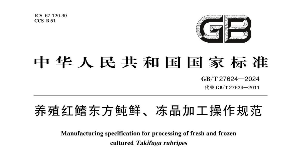 國(guó)家標(biāo)準(zhǔn)GB/T27624-2024《養(yǎng)殖紅鰭東方鲀鮮、凍品加工操作規(guī)范》正式發(fā)布